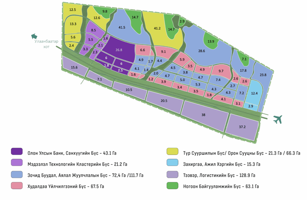 - Мэдээллийн технологийн кластер, Дата төв, Дрон хөгжүүлэх орчин, Судалгаа шинжилгээний Лабораториуд, Олон улсын бизнесийн төв, Олон улсын хурал, зөвлөгөөн, үзэсгэлэн, урлаг болон спортын арга хэмжээ зохион байгуулах боломж бүхий иж бүрэн цогцолбор, Аялал жуулчлалын цогцолбор хотхон, Технологи, инновацид суурилсан хүнсний ногоо, жимсгэний тариалан, Тээвэр логистикийн төв.